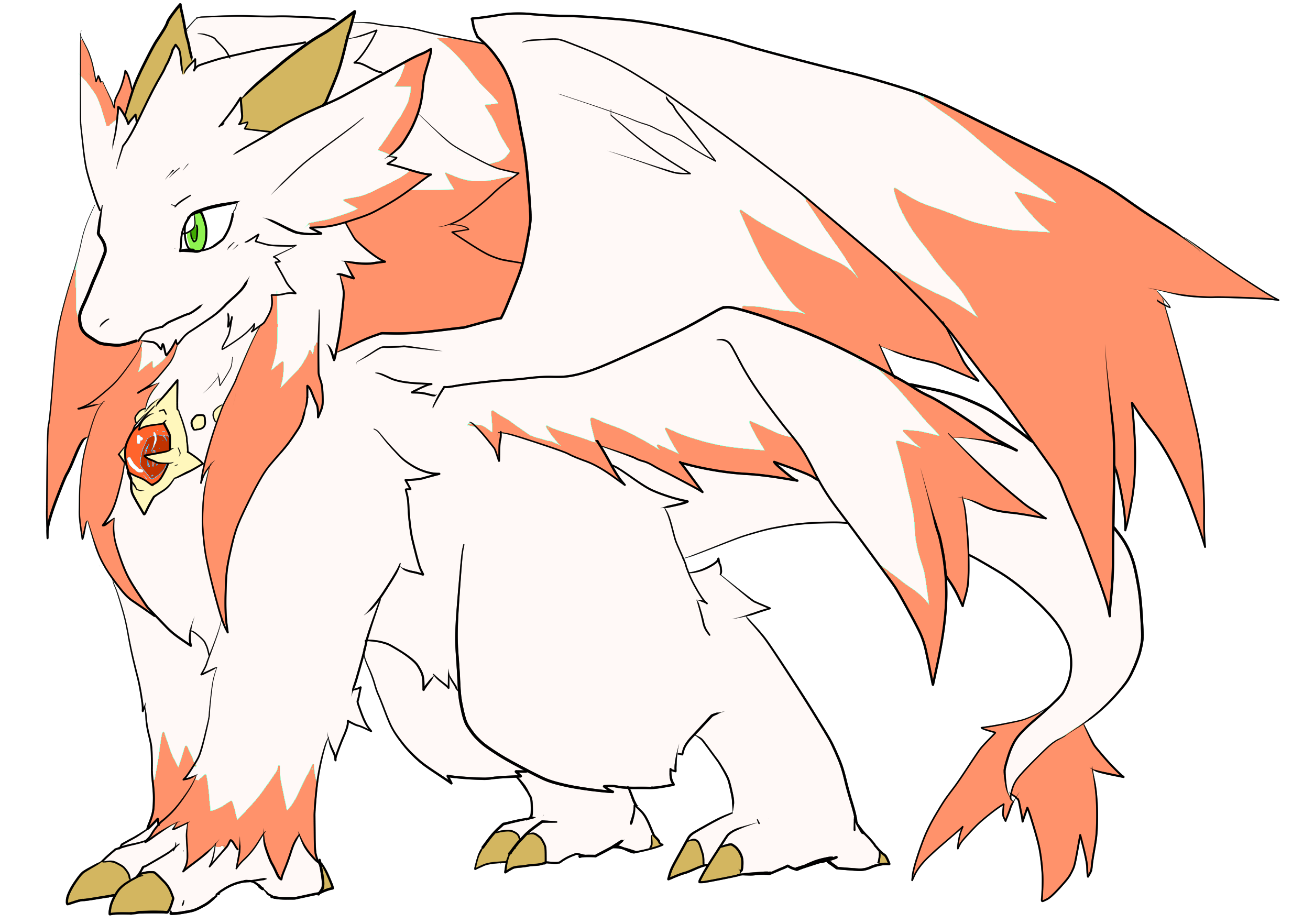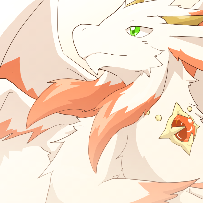 仄かにオレンジの毛並みと四対の大きな翼をもち『狼の血』をもつラーシャイン一族の者だ。狼の血を持つため全身は鱗ではなく毛並みであり、毎日欠かさずケアをしている。